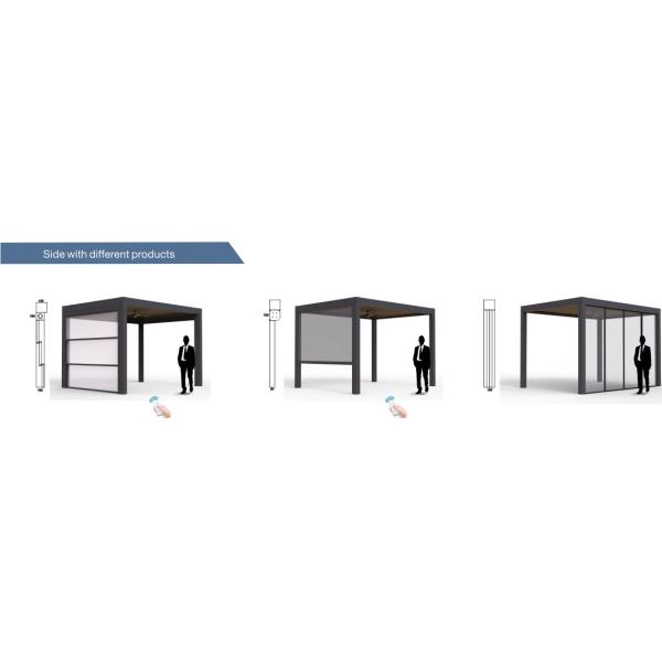 2.Fully Sealed Rubber with the best protection function : The Louver blade Fully Sealed,this technology is all patented ,we can make a difference to bring you the best result for the waterproof ,best protection against the rain.Furthermore, we use 150x150mm big post 2.5mm and 123x170mm 2.1mm big gutter,thicker materials, it can process a rainfall with more than an intensity of 0.04 to 0.05 l/s/m2, drain out the heavy rain quickly. Fully Sealed Design can make sure of the best quality for the protection from the rain ,inside the pergolas ,with the all aluminium accessories ,it is gonna be with the best advantages ,it is with the best quality ,not able ,not easy to get rusted ,get corrosive .